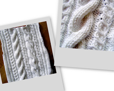Je tricote un modèle Phildar (un vieux catalogue) avec de la laine Aviso blanche. Elle est très agréable à manipuler, j’adore ! ^^