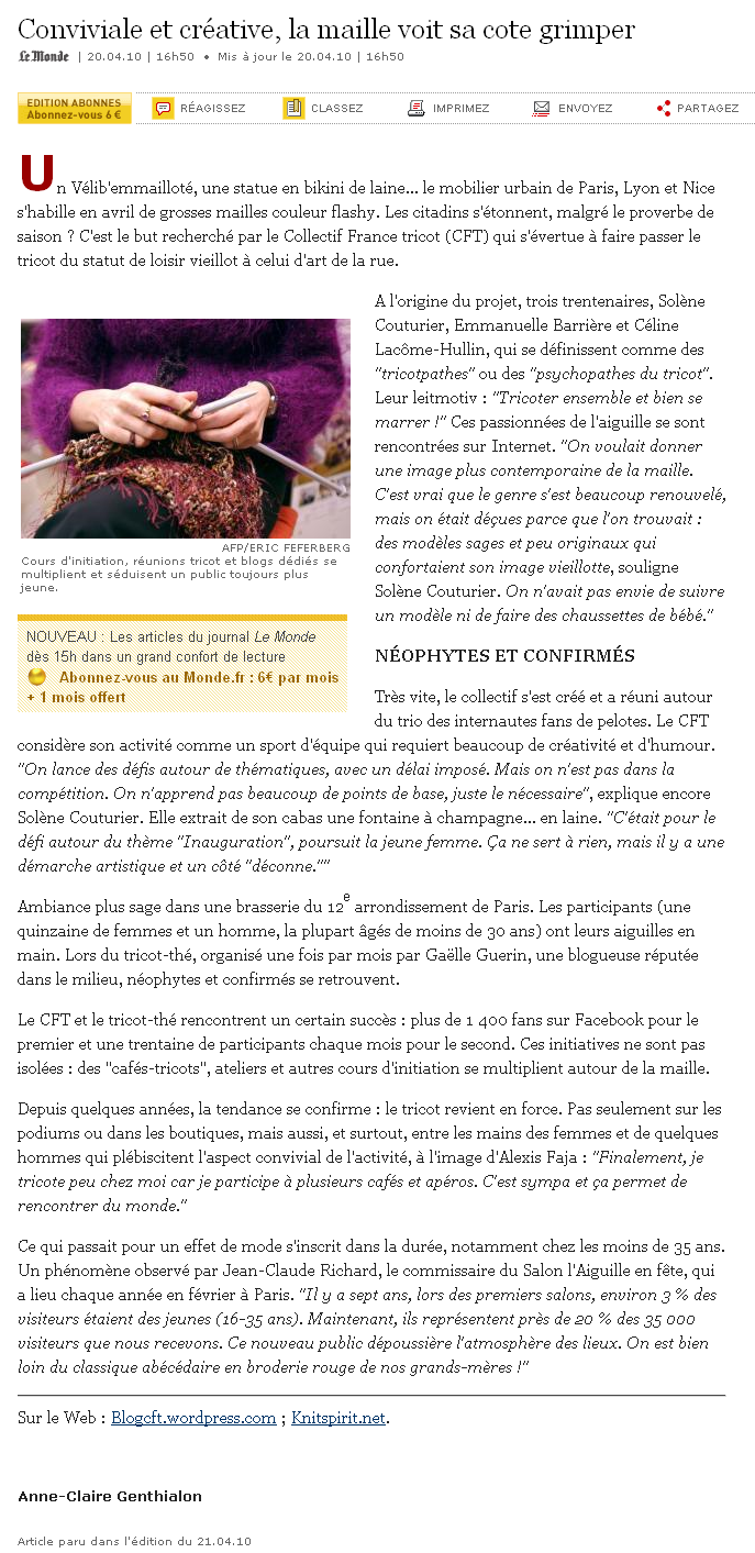 Mon mari vient de me forwarder l'article car ca parlait de tricot! Ca c'est la classe, le petit reward apres des heures et des heures de blogging…