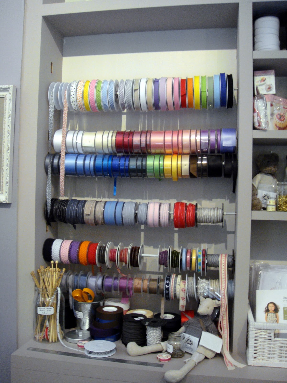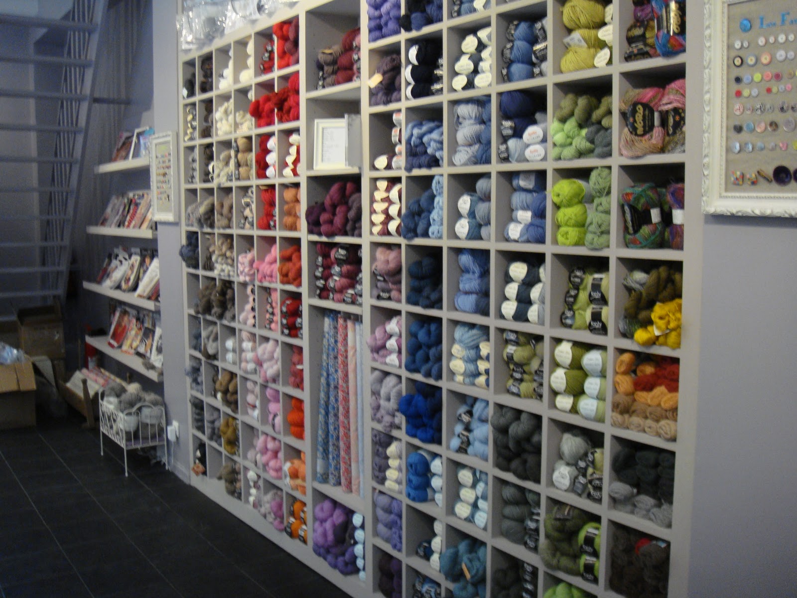 Tout d’abord, lorsqu’on entre, on arrive face à un immense mur de fils à tricoter rangés par couleurs –> trop trop beau, je vous dis (j’ai même dit à l’homme : “faudrait la même chose à l’appart” et il a dit “ouais mais faudrait que ce soit vitré pour éviter la poussière”) ! Alors forcément, on reste scotché ! A droite un peu plus loin, il y a plein de rubans et la caisse est au fond. Sur la gauche, il y a un canapé et le coin librairie (où j’ai vu mon livre ! hiiiiii ! *cri hystérique*) avec un escalier qui donne sur l’espace couture (il est possible de louer des machines à coudre et de prendre des cours sur place).