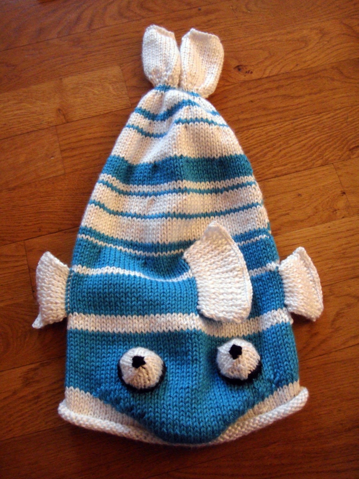 Le gros avantage de ce patron, c’est qu’on peut le tricoter avec des restes de laine en faisant des poissons rayés.