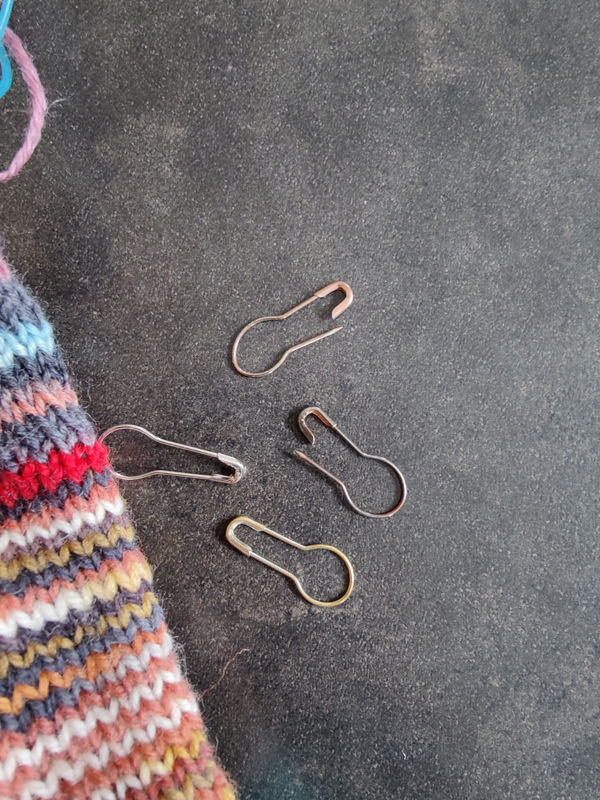 Ils sont épinglés à l’ouvrage. Ils permettent de se repérer pour mesurer certaines parties de l’ouvrage ou pour compter le nombre de rangs tricotés. Pour les chaussettes, par exemple, je place un marqueur amovible à la fin de la partie “Pointe du pied” afin de mesurer facilement la partie suivante qui est la partie “Pied”.