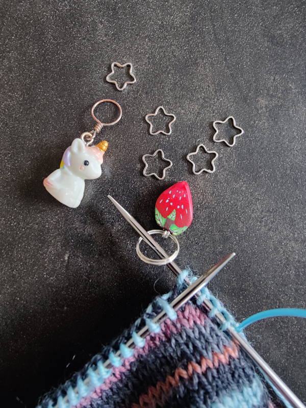 Appelés aussi “anneaux marqueurs”, ils sont placés entre les mailles. Ils permettent de délimiter un nombre de mailles précis et évitent d’avoir à recompter systématiquement. Ils sont très pratiques pour se repérer dans la dentelle par exemple.