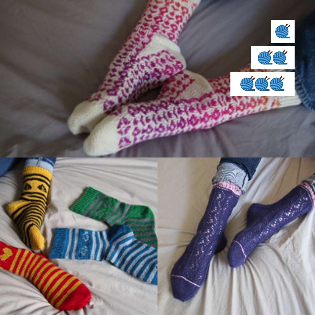 Tous les patrons sont évolutifs avec 3 niveaux de difficultés : Débutant, Intermédiaire et Avancé. C’est parfait pour se lancer dans le tricot de chaussettes et / ou se perfectionner.